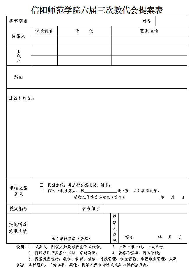 请下载附件: 信阳师范学院六届三次教代会提案表.doc